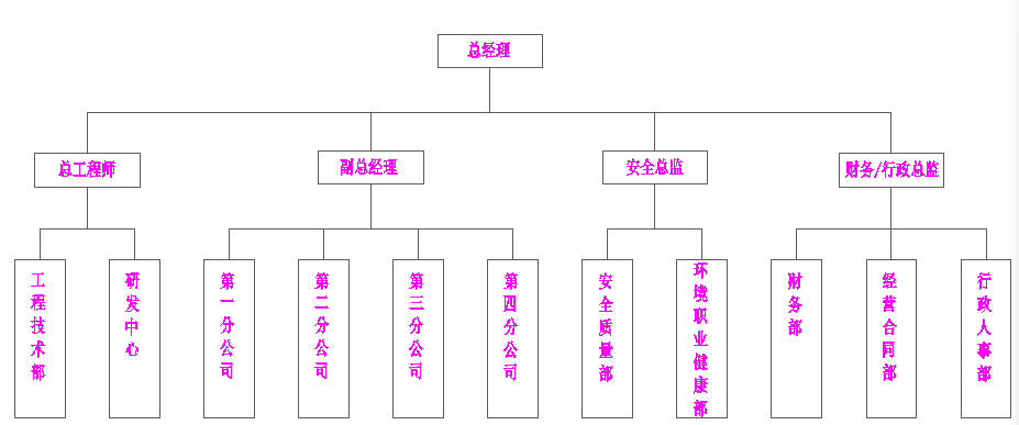 实行总经理负责制,下设总工程师、副总经理、安全总监、财务/行政总监四个机构,各机构分管工作如下: